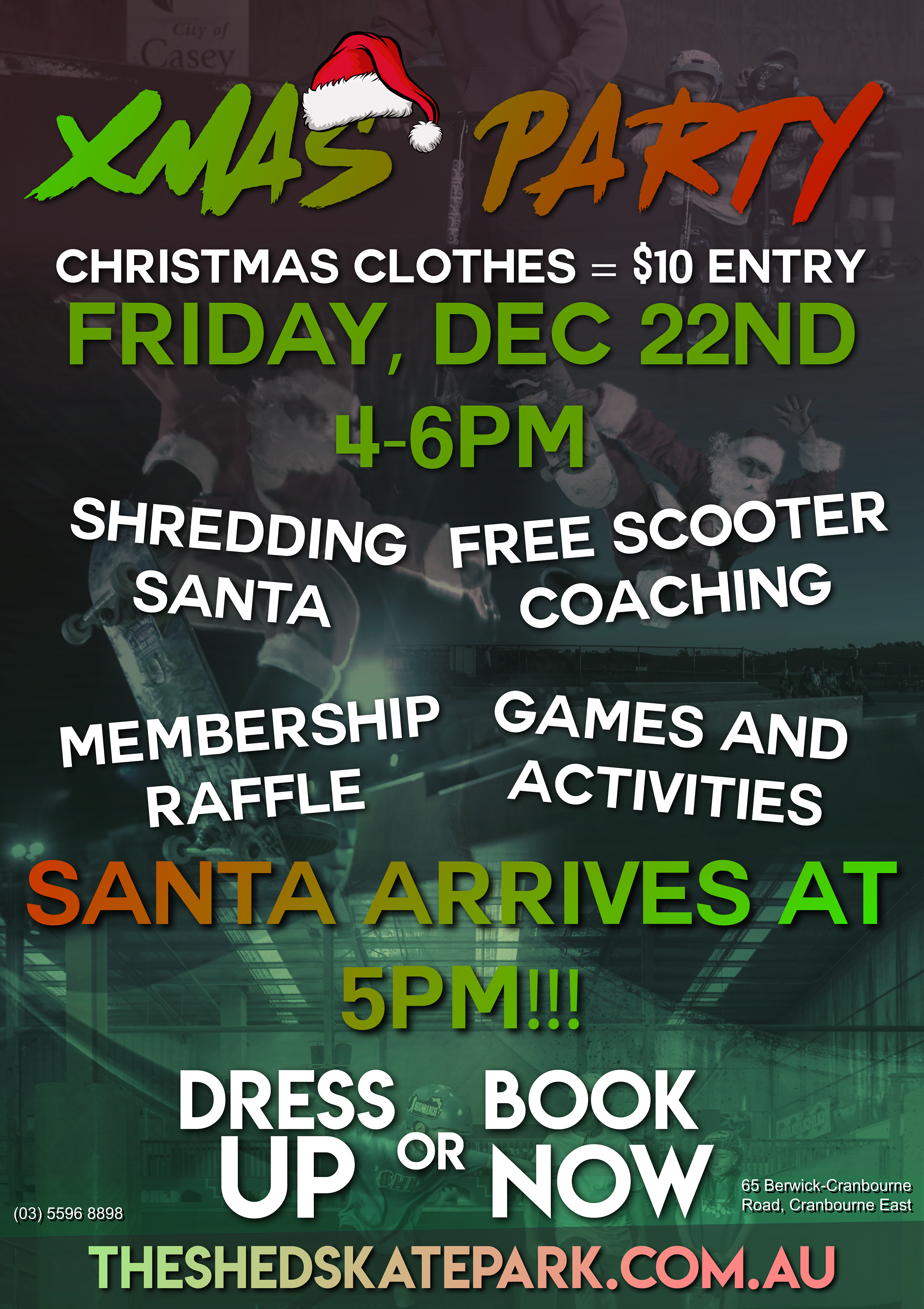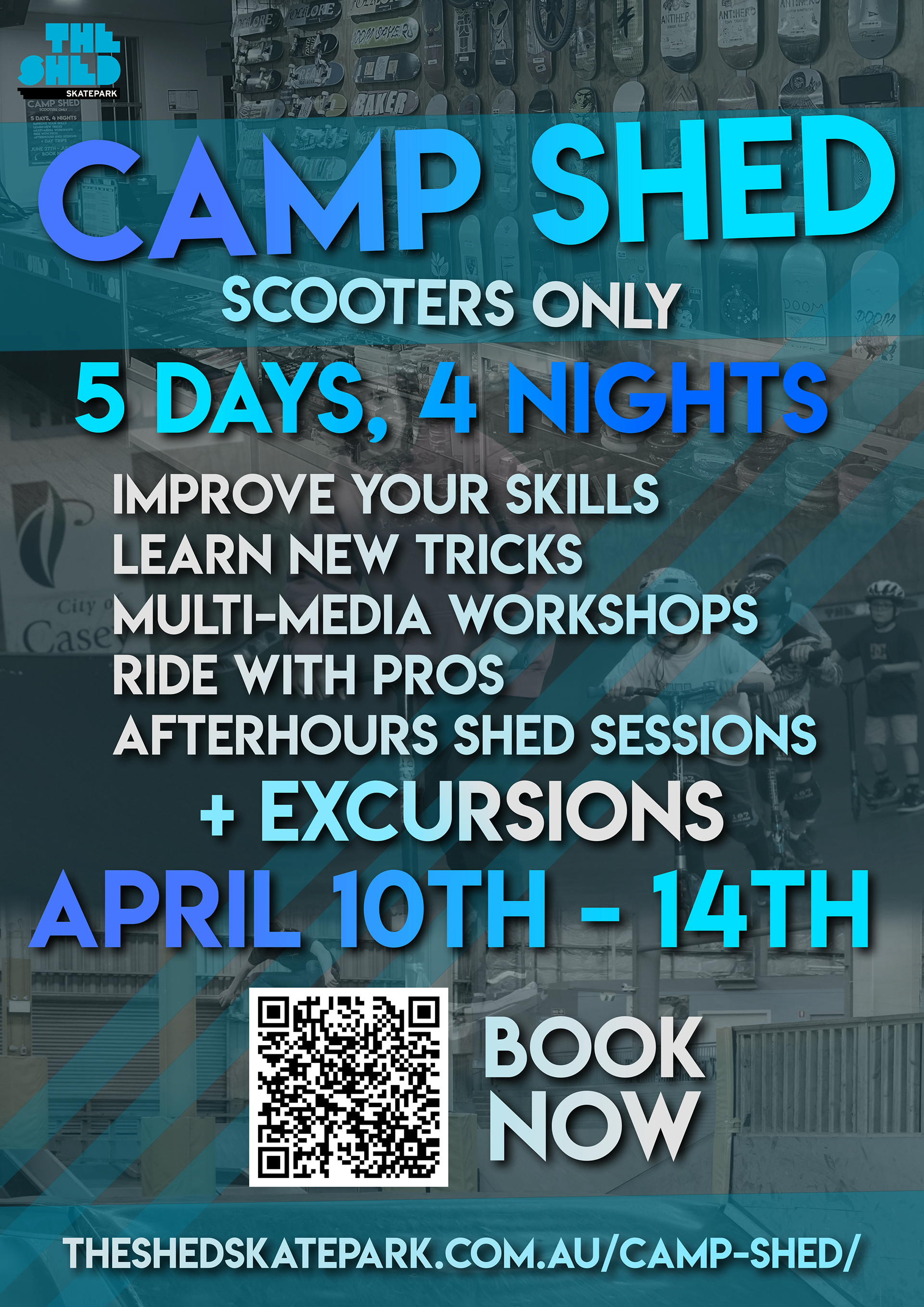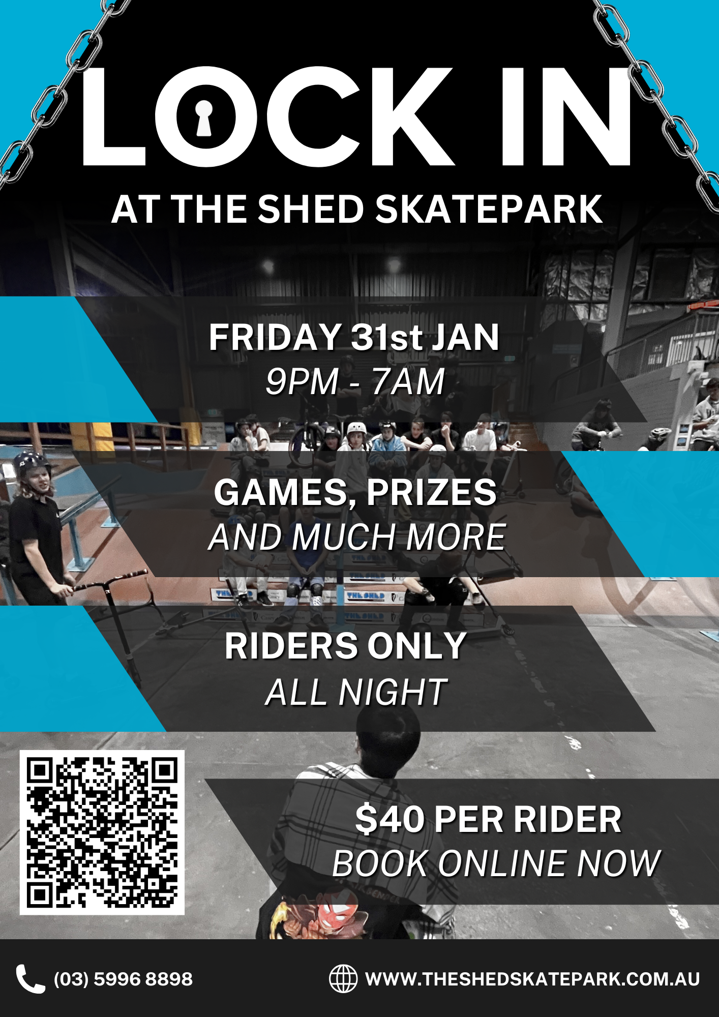 Since 2021, I have worked at Australia's premier indoor skatepark, The Shed Skatepark. I originally started as a casual staff member and have since worked my way to being a part-time Duty Captain (manager). I produced multiple posters that helped promote business offerings and events. These posters were printed physically and placed around the skatepark, as well as being posted on our social media accounts. All poster's reuse the same fonts, colour scheme and structure to maintain brand consistentency.
